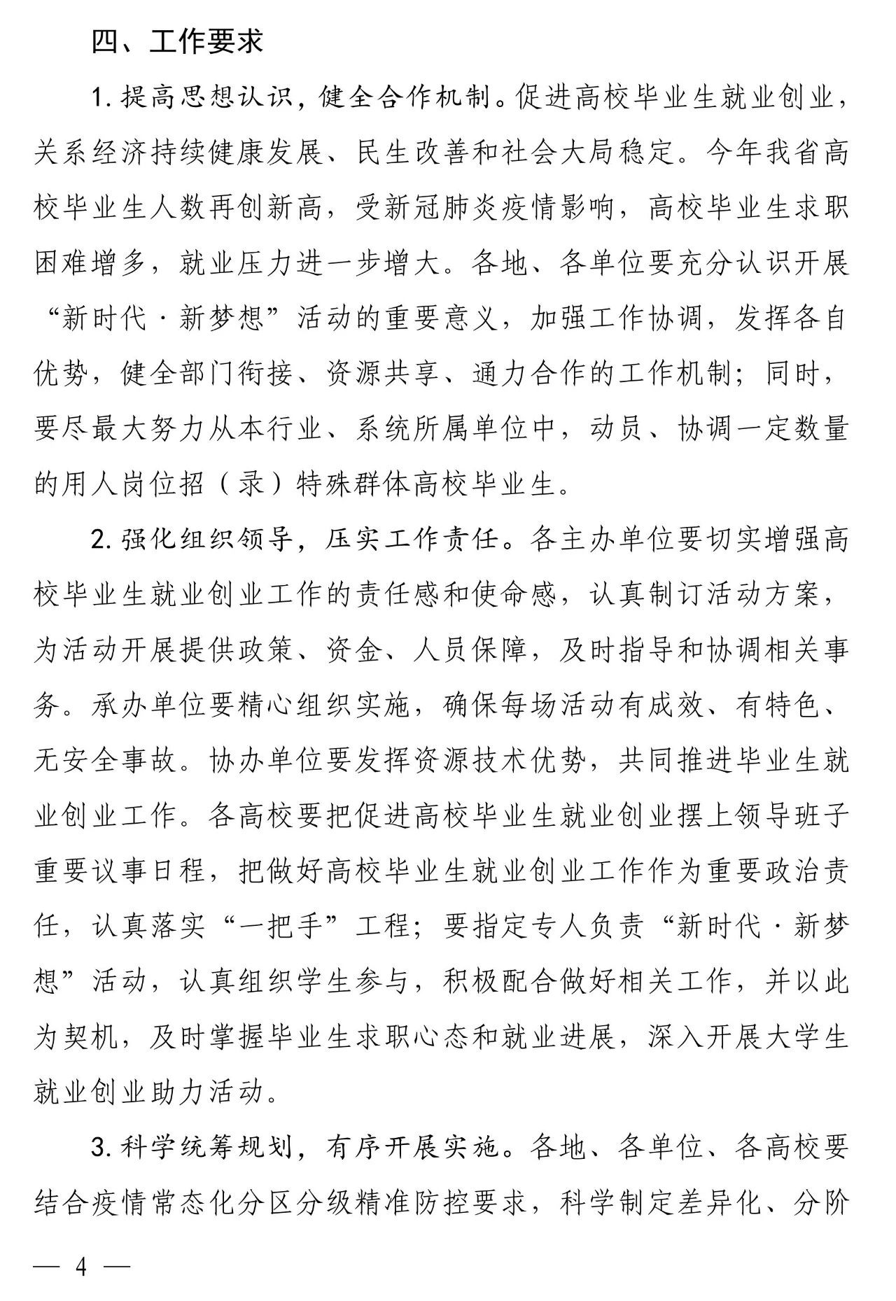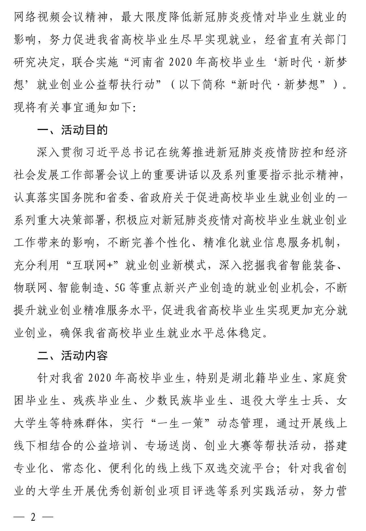 为落实教育部等六部门2020届普通高校毕业生就业“百日冲刺”行动,最大限度降低新冠肺炎疫情对高校毕业生就业的影响,省教育厅、省发展和改革委员会、省工业和信息化厅、省财政厅、省人力资源和社会保障厅、省文化和旅游厅、省退役军人事务厅、省人民政府国有资产监督管理委员会、省军区动员局、共青团河南省委员会、省妇女联合会、省残疾人联合会、省工商业联合会、国家开发银行河南省分行14部门于近日联合下文,共同实施“河南省2020年高校毕业生‘新时代·新梦想’就业创业公益帮扶行动”。
