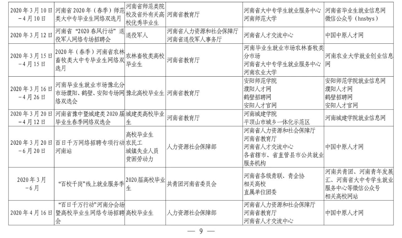 同时通过河南省毕业生就业信息网(<http://hnbys.haedu.gov.cn>)、河南就业网(www.jiuye.gov.cn <http://www.jiuye.gov.cn>)、中国中原人才网(www.zyrc.com.cn <http://www.zyrc.com.cn>)、各普通高等学校毕业生就业信息网、河南高校就业创业新媒体矩阵、省大中专学生就业服务中心微信公众号等平台开辟就业创业指导网络课堂和最新政策宣传专区,为疫情期间毕业生求职创业答疑解惑,提供政策信息支持。