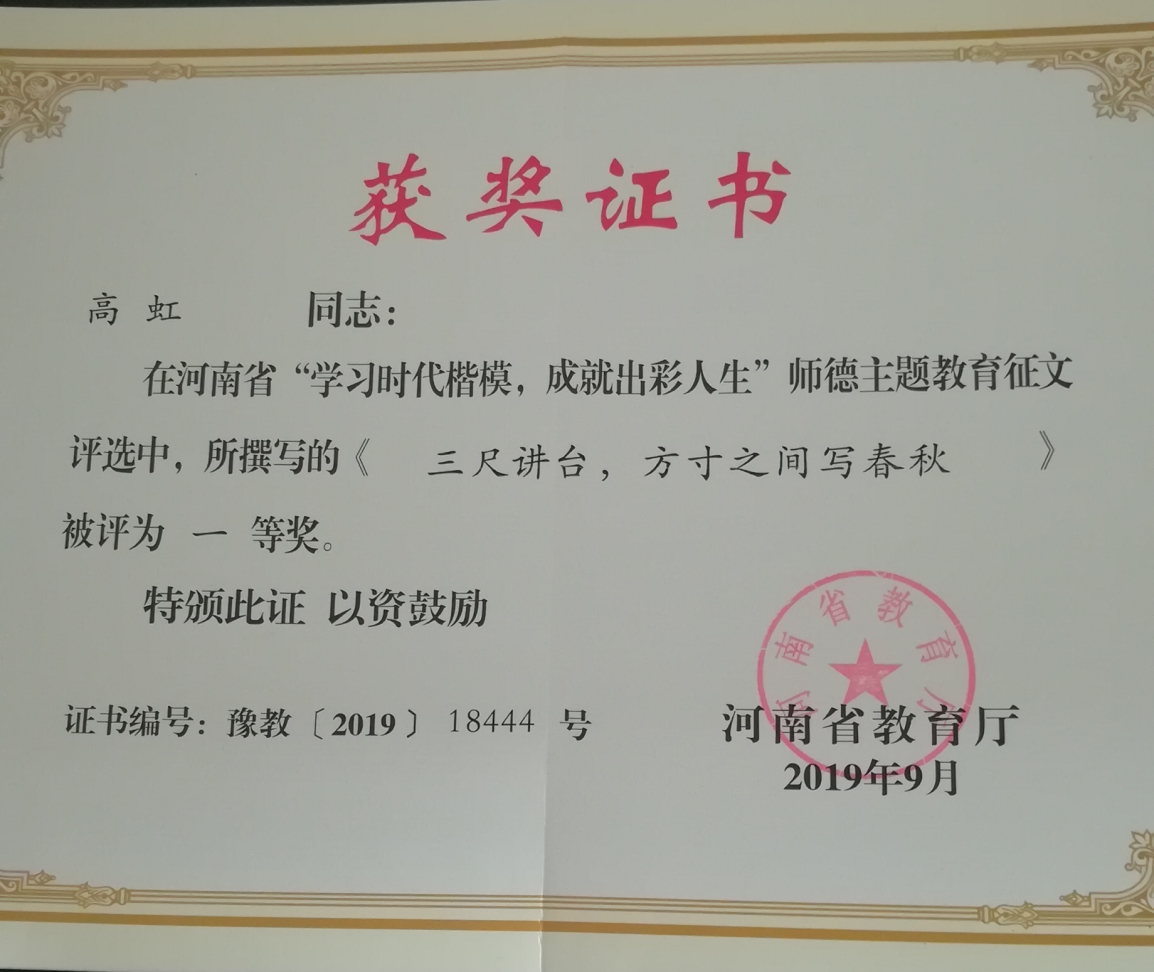 近日获悉,我校外国语学院高虹老师在河南省“学习时代楷模,成就出彩人生”师德主题教育征文评选中,所撰写的《三尺讲台,方寸之间写春秋》被评为一等奖。