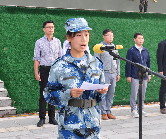新生代表外国语学院王甜甜发言。她表示,短短的一周训练时间,从教官的训练中学到了如何强健体魄、磨练意志;从辅导员那里体会到了如父母般深切的关怀;从学长那里汲取到了宝贵的学习和校园生活经验。作为新时代大学生,要用努力和拼搏唱响属于自己的青春之歌;要时刻牢记“明德 励学 笃行 创新”的校训,奋斗不息、砥砺前行!