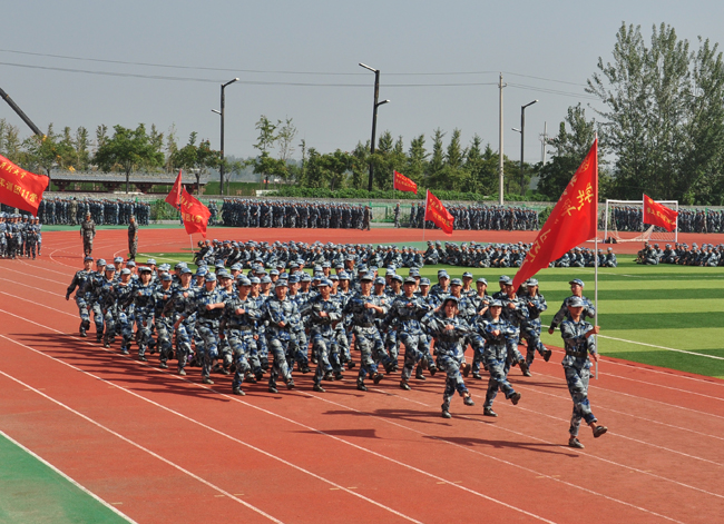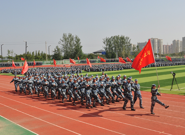 伴随着激昂豪迈的《分列式进行曲》,67个训练有素、气宇轩昂的军训连队踏着铿锵的音乐节拍,迈着整齐的步伐依次走过主席台。一个个整齐的方队、一张张青春的面孔、一声声嘹亮的口号、整齐的步伐、飒爽的英姿,充分展现了开大学子自强不息的精神风貌。