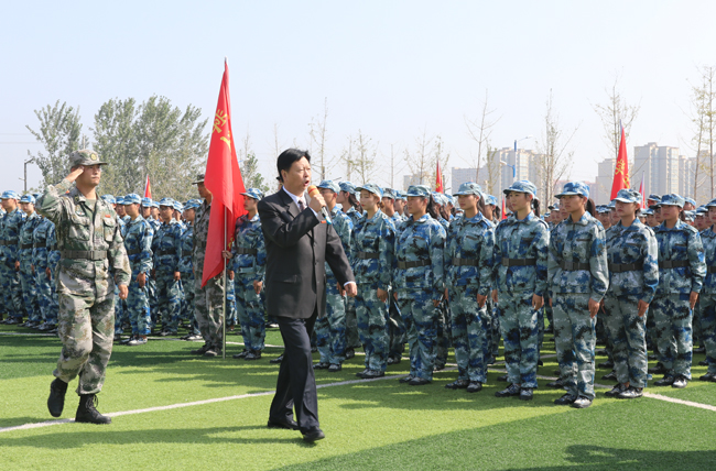 军训工作领导小组组长、校党委副书记储建新代表学校向承训部队官兵和老师们表示衷心的感谢!向圆满完成军训任务的同学们表示热烈的祝贺!他强调,我校党委历来高度重视国防教育工作的开展,坚持把军训作为新生入校的第一课,把国防教育作为强化学生素质教育的重要环节和手段,通过搭建“军事理论课+军事训练+征兵宣传”平台,丰富国防教育模式;搭建“军事理论课教师+地方国防指导员+学生工作队伍 ”平台,强化国防教育队伍建设;搭建“第一课堂+第二课堂+新媒体”平台,扩大国防教育覆盖面。同学们在军训中继承和发扬了人民军队不怕困难、连续作战的革命精神和优良传统,斗志昂扬,挑战自我,严格要求,刻苦训练,经受住了“累”与“苦”,“艰”与“难”的考验,教官关心学生,老师爱护学生,学生尊敬教官,军民情,师生情,同学谊,大家用实际行动践行了军民鱼水情,圆满完成了此次军训任务。储书记希望大家以习近平总书记在全国教育大会上的讲话精神为指引,围绕立德树人的根本目标,在坚定理想信念、厚植爱国主义情怀、加强品德修养、增长知识见识、培养奋斗精神、增强综合素质六个方面下功夫,在立德树人的教育实践中培养出更多更好能够满足党、国家、人民和时代需要的创新型、复合型、应用型人才,无愧于时代赋予的光荣使命。