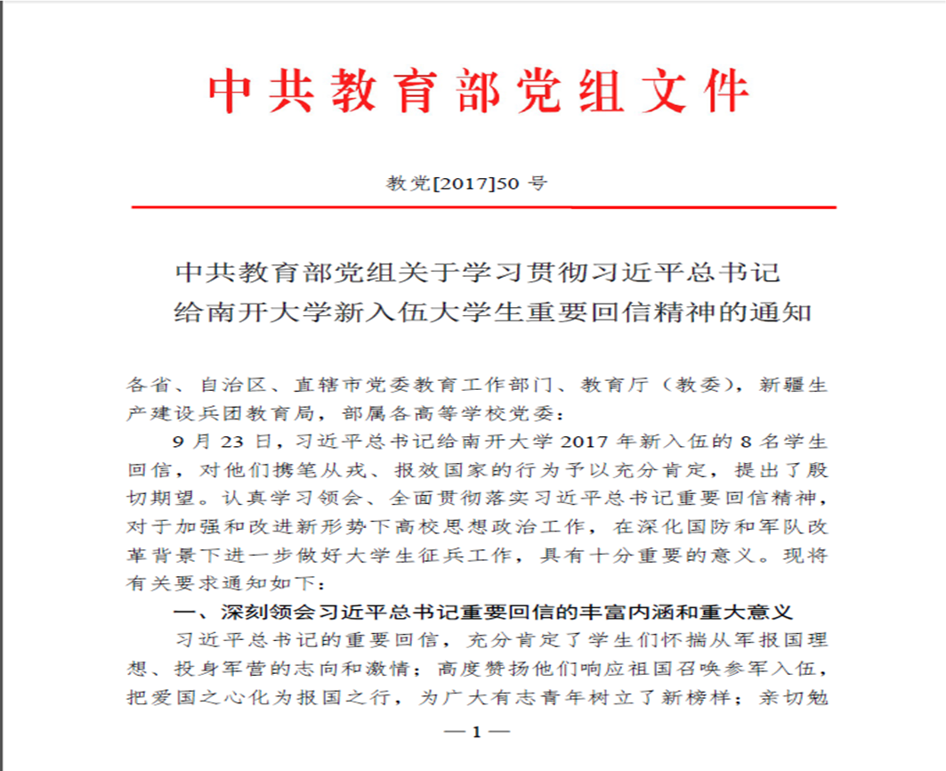 中共教育部党组关于学习贯彻习近平总书记给南开大学新入伍大学生重要回信精神的通知