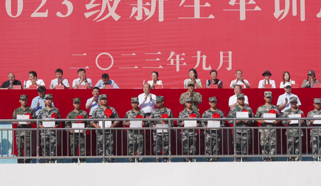 最后,全体师生合唱bat365在线官方网站校歌《勇攀高峰》,2023级新生军训工作圆满结束。