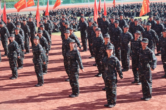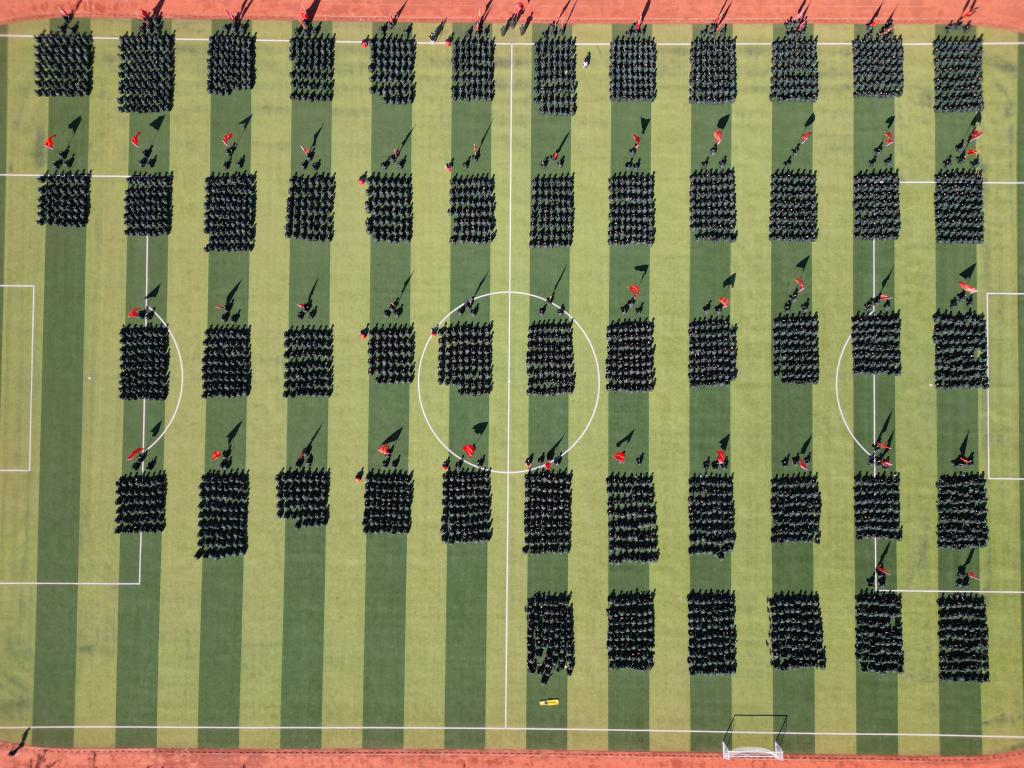 伴随着激昂豪迈的音乐,我校12个院部组成的55个军训连队,在教官的带领下,依次走到主席台前接受检阅。行进、踏步、敬礼,各连队喊着响亮的口号,迈着铿锵有力的步伐,在整齐划一的英姿中展现出排山倒海的气势和开大学子的卓越风采,为“大学第一课”交出一份精彩的答卷。