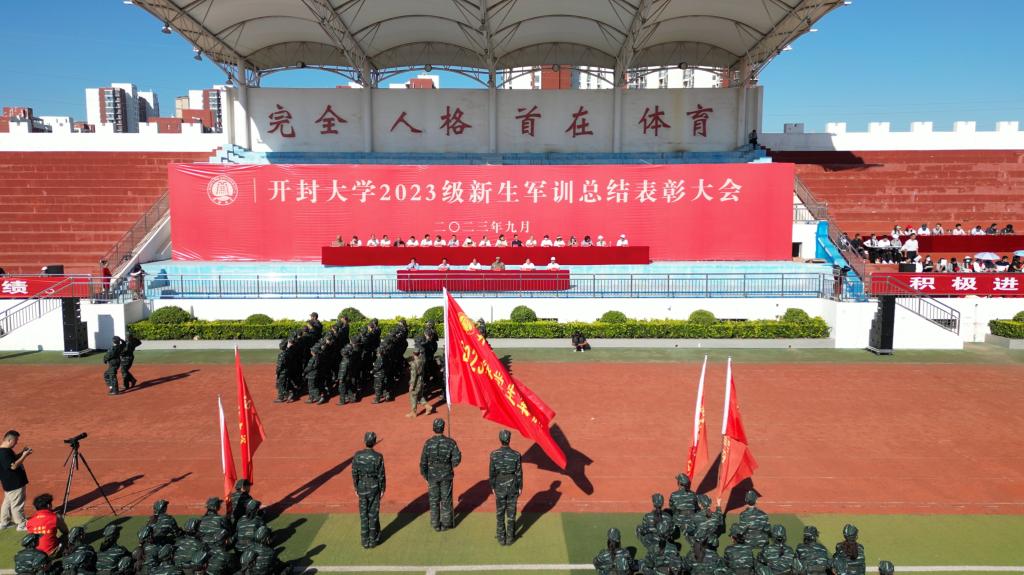 本站讯 9月22日,我校2023级新生军训总结表彰大会在体育场举行。校领导储建新、万是明、曾小平、谢文忠、马林强,开封市龙亭区人民武装部中校副部长王千里出席大会,军训工作领导小组成员,各院部党总支书记、院长及4700余名新生参加大会。大会由副校长万是明主持。