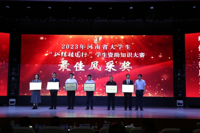 本站讯 5月29日—6月1日,河南省大学生“诚信校园行”学生资助知识大赛总决赛在南阳理工学院落下帷幕,我校在大赛中荣获金奖、最佳风采奖和优秀组织奖。校党委委员、工会主席成芳带领学生资助管理中心及相关院部负责人共同到场观看比赛并领奖。