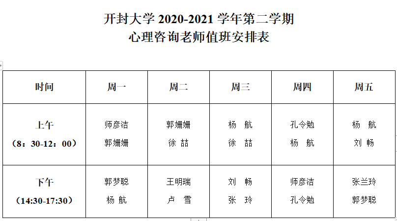 为更好的服务广大同学,帮助大家解决学习和生活中遇到的心理困惑。结合实际情况,我校2020-2021学年第二学期心理咨询安排如下: