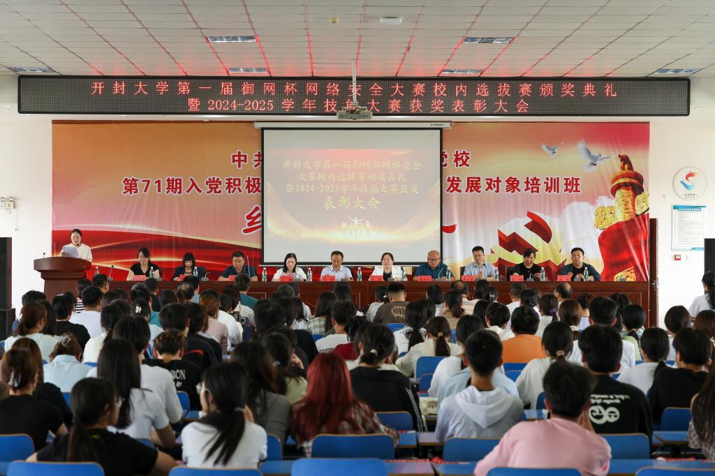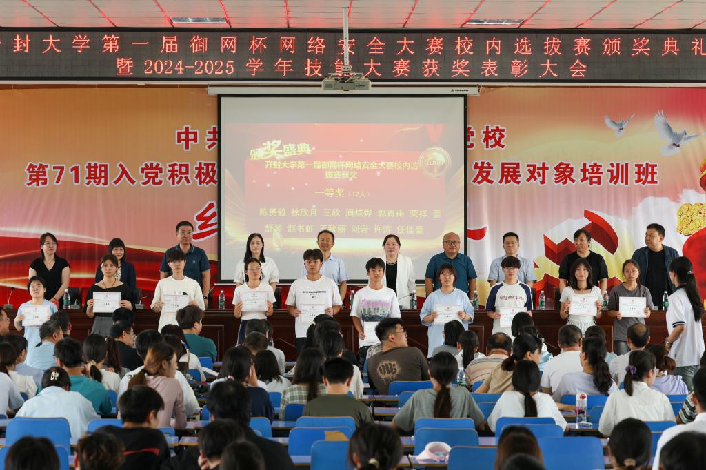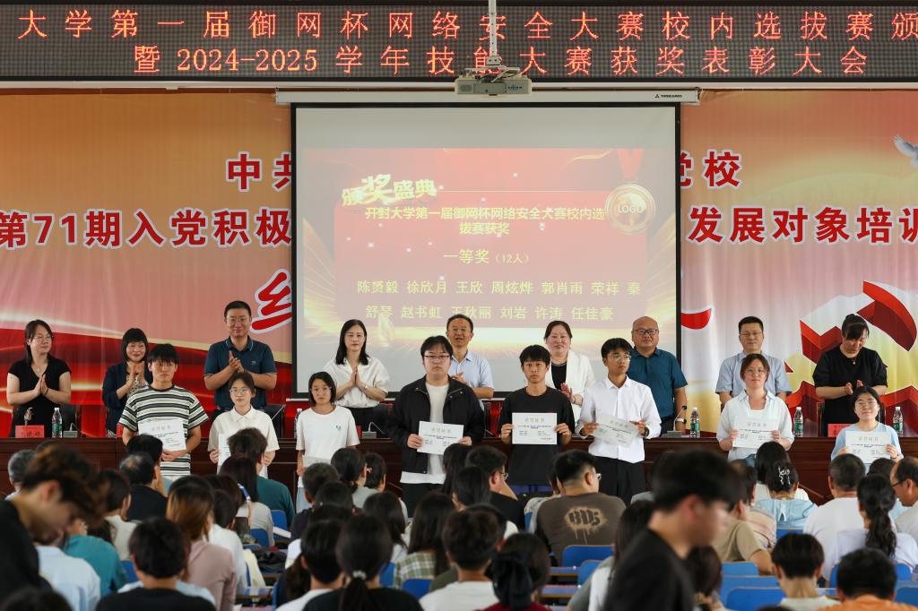 本站讯 6月12日下午,信息工程学院(软件职业技术学院)在8号楼六楼报告厅举行第一届御网杯网络安全大赛校内选拔赛颁奖典礼暨信息工程学院2024-2025学年技能大赛获奖表彰大会。我校副校长李治、教务处处长王茜、学院领导班子及企业嘉宾出席了本次表彰大会,会议由学院数学教研部主任赵展主持。