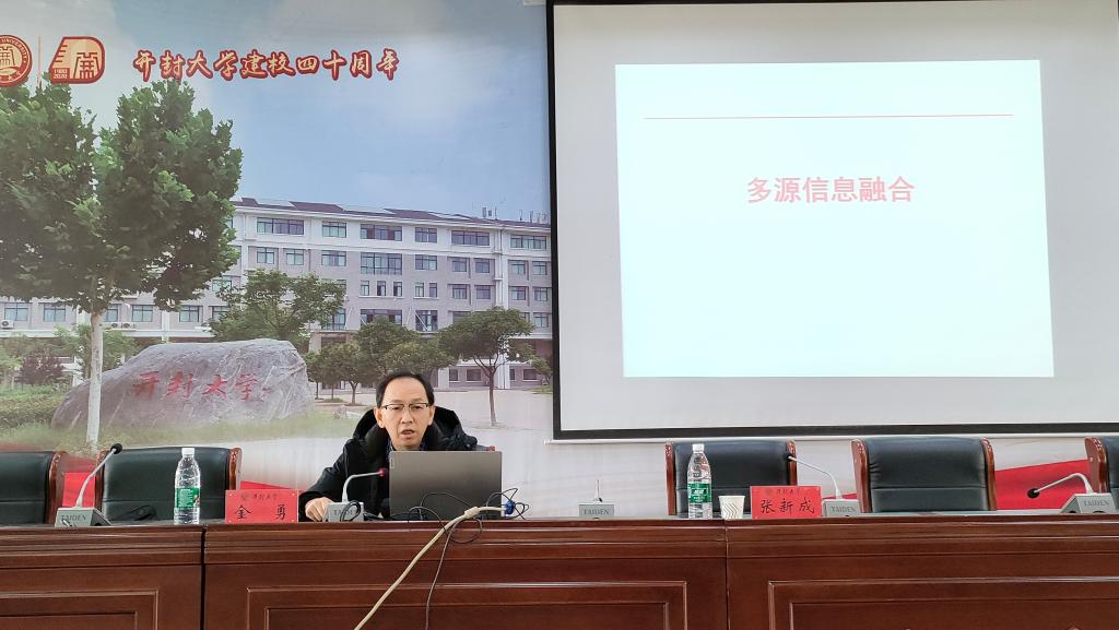 本站讯 12月12日下午,由河南大学金勇教授主讲的“开大讲坛”第二十七讲——《多源信息融合理论与技术发展》在 8号楼报告厅成功举办。此次活动由信息工程学院主办,院长张新成主持,全院300余名师生认真听取了讲座。