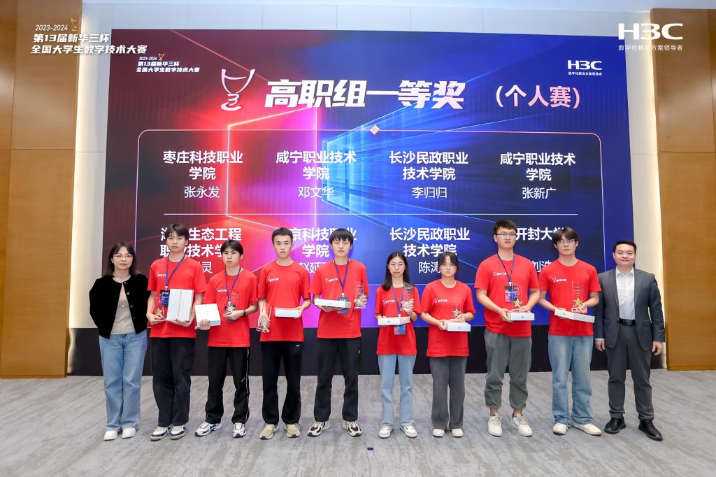 本站讯 近日,2023-2024年第13届新华三杯全国大学生数字技术大赛总决赛在新华三集团杭州总部落下帷幕,我校母军臣和付红杰两位老师指导的学生获得个人赛一等奖1项,三等奖2项,团队赛二等奖,其中个人赛一等奖是河南省目前的最佳成绩,获得了突破。