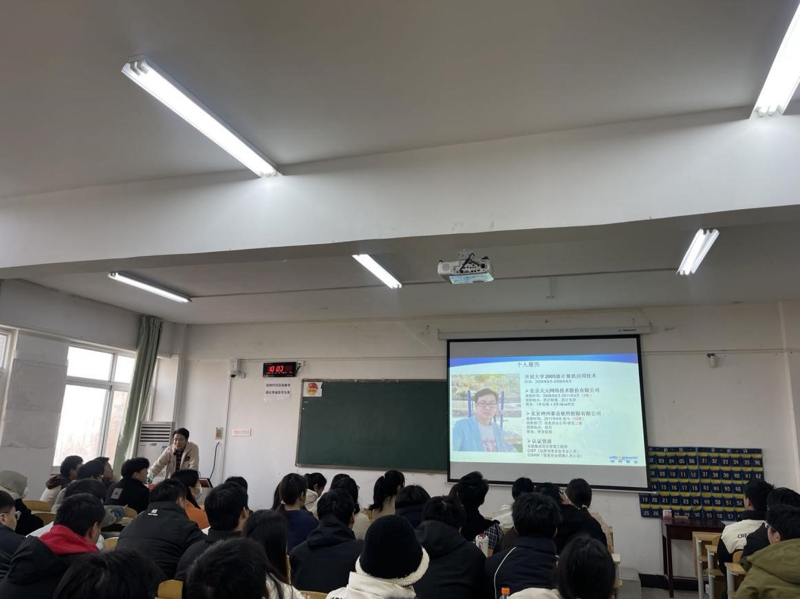 本站讯 12月9日上午,信息工程学院邀请优秀校友—北京神州泰岳软件股份有限公司(郑州分公司)研发经理林新政在3号楼402教室开展“规划精彩人生,成就IT职业梦想”主题讲座。讲座由副院长王晓婷主持,学院老师和2023级计算机应用技术专业、软件技术专业100余名学生参加。