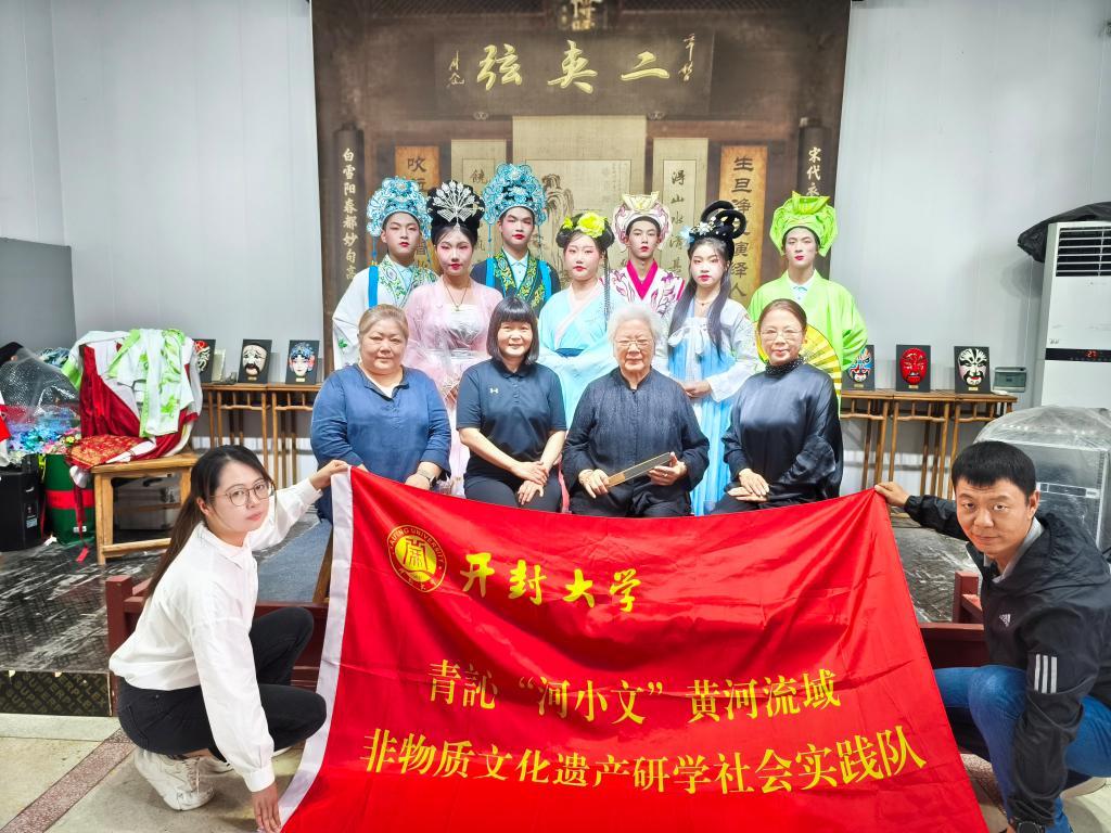 在非物质文化遗产研学社会实践活动中,实践队的同学们在开封市文广旅局的大力支持下,前往开封市爱国主义教育基地——“田爱云二夹弦剧团”,在以往基础上继续深入开展“二夹弦技艺专题研学活动”。国家级非物质文化遗产二夹弦代表性传承人田爱云,与吴筱曼、吴小玲两位老师教授同学们戏曲步伐、礼仪及基础唱腔,并指导大家演唱新时代唱段《最是风雅书店街》。同学们在大师们的指导下,对二夹弦的历史与发展,以及如何发挥自身力量去促进黄河流域非物质文化遗产保护与传承,有了更新的认识。