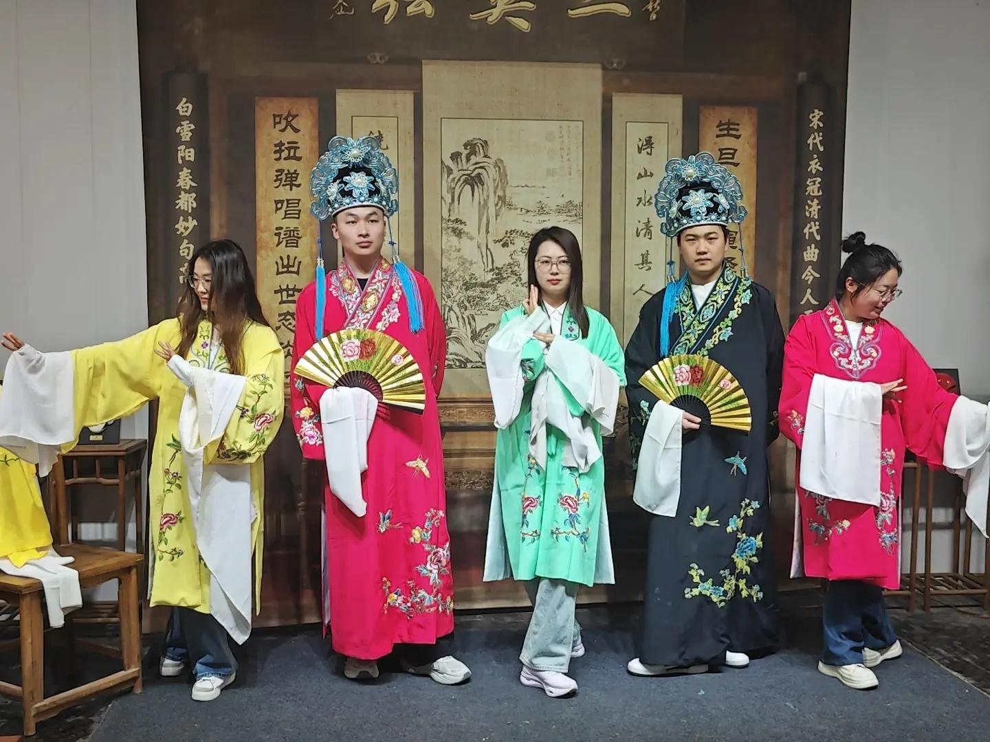 活动伊始,在学生党支部书记贺钰的带领下,全体党员高举右拳,面对党旗,重温入党誓词。活动中,国家级非物质文化遗产二夹弦代表性传承人田爱云老师,分享自己刻苦学习二夹弦技艺和为二夹弦的传承发展所付出的不懈努力,并清唱了一段代表性曲目,赢得阵阵掌声。随后,二夹弦传承人吴小玲老师为师生们介绍了二夹弦的发源、形成、乐器特点以及角色扮相等内容,让大家对这一传统艺术形式有了更深入的了解。吴筱曼老师则邀请党员们换上戏服,现场教授二夹弦的经典戏曲表演动作,师生们在亲身体验中感受了非物质文化遗产的独特魅力。最后,双方就今后进一步合作开展 “非遗进校园”、“非遗选修课”等非遗传承活动进行深入交流。