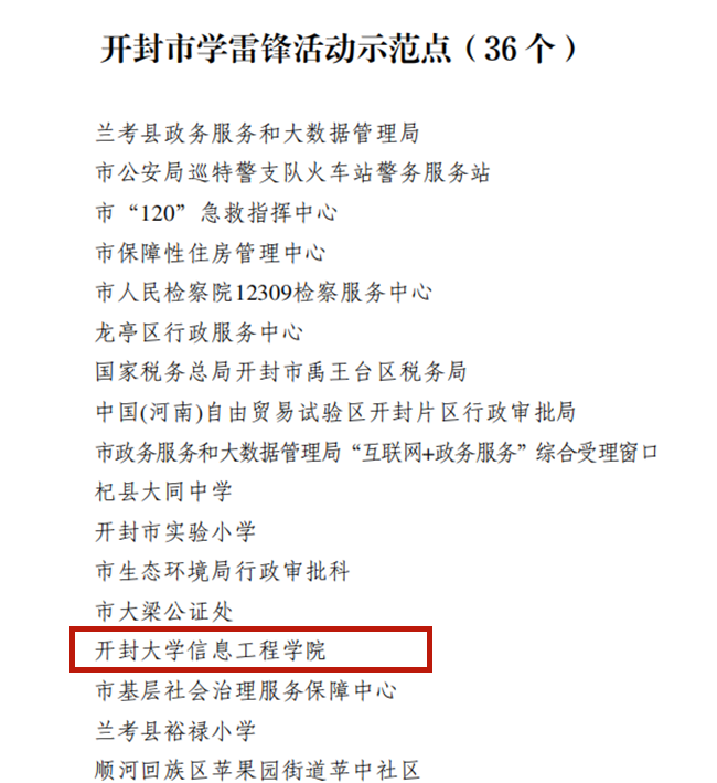 本站讯 近日,中共开封市委宣传部下发《关于命名第三批开封市学雷锋活动示范点和岗位学雷锋标兵的决定》(汴宣文〔2023〕24号)文件,bat365在线官方网站信息工程学院被命名为第三批开封市“学雷锋活动示范点”。