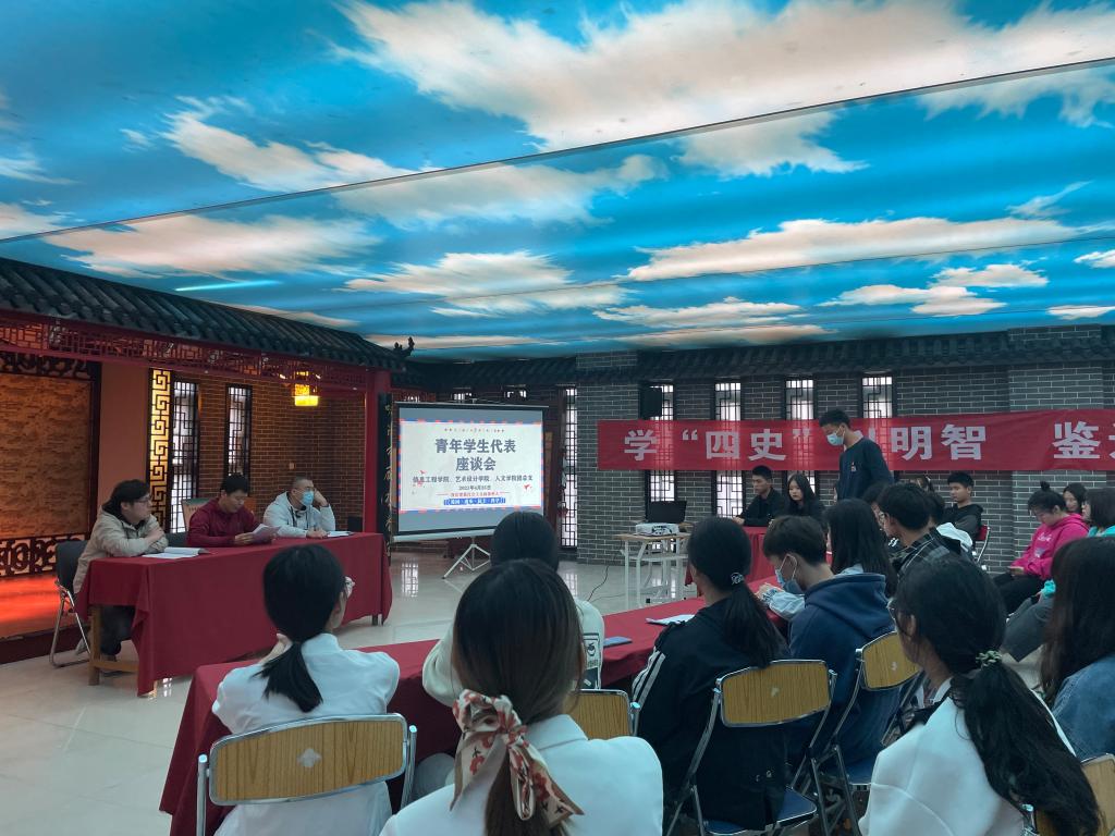 本站讯 为纪念五四运动102周年,引领广大青年学生传承和发扬五四精神,在五四青年节即将到来之际,信息工程学院、人文学院、艺术设计学院团总支在14号楼“文化家”联合召开青年学生座谈会,学习贯彻学校纪念五四运动102周年暨五四表彰大会会议精神。信息工程学院团总支负责人贺钰老师、人文学院团总支负责人胡超老师、艺术设计学院团总支书记孙巳尧老师与三个学院此次受到表彰的先进集体和青年团员代表60余人参加了此次座谈会。座谈会由贺钰老师主持。