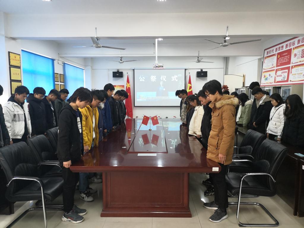 上午10点,学院团总支组织学院各年级团支部代表,在学院会议室观看了国家公祭日悼念活动直播。辅导员贺钰老师在观看直播后,带领各团支部代表惦念逝者的和平宣言。各团支部也利用课间时间观看了惦念仪式直播,并通过登录国家公祭网进行网上悼念。