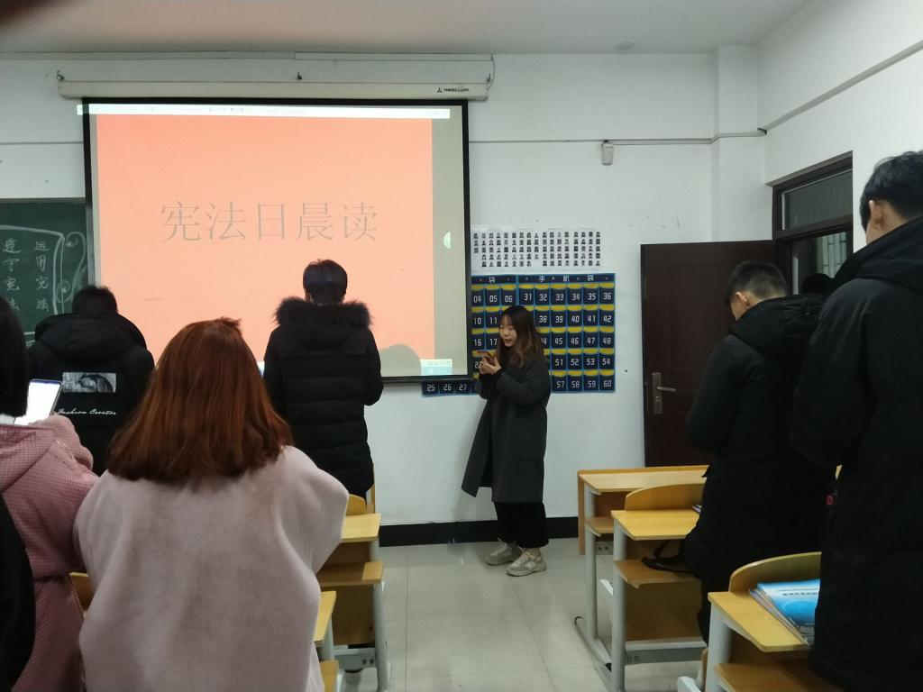 12月2日清晨,在学院升国旗仪式仪式上,党总支副书记高剑南,对学院全体同学进行了宪法知识普及教育,各班级在升旗仪式结束后,结合教育内容开展了宪法晨读活动。此外学院还以班级和寝室为单位开展了教唱“宪法之歌”;注册“宪法卫士”、争当“宪法卫士”;宪法知识学习、讨论等活动。