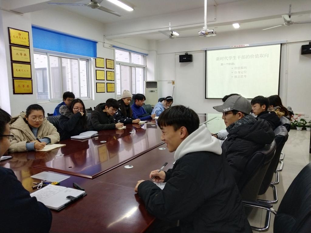 本站讯 1213日,信息工程开展了学生干部培训会,会议由学院党总支副书记韦志鹏主讲,他培训的主题为“新时代学生干部的价值取向”的培训会。