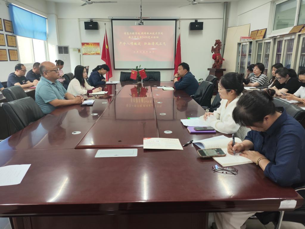 本站讯 为深入贯彻落实中央八项规定精神,强化党员党性修养与作风建设,5月29日下午15:00在3号楼会议室,信息工程学院教工党支部开展了“严守八项规定 弘扬清风正气”主题党日活动。