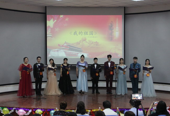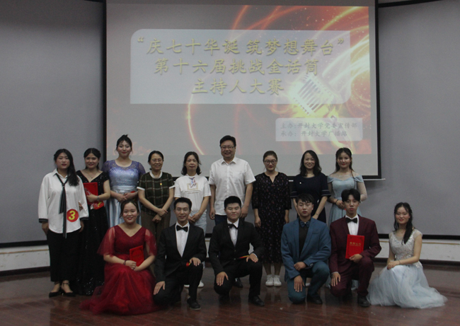 本站讯 6月13日,由我校党委宣传部主办的“庆七十华诞 筑梦想舞台”第十六届挑战“金话筒”主持人大赛决赛在国际教育学院一楼报告厅举行。大赛邀请了主任播音员、河南省十佳播音员、开封市专业技术拔尖人才、开封市朗诵协会副会长计亮,开封报业集团记者宋献霞,开封广播电视台记者苏洁婷,我校党委组织部统战部部长赵海胜,党委宣传部部长陈岩,公共艺术教研部副主任刘莎莎担任大赛评委。各院部师生代表200余人参加并观看了比赛。