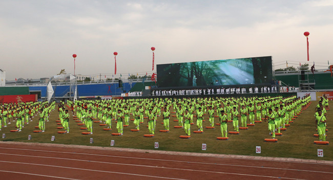 由我校机械与汽车工程学院和财政经济学院学生组成的600人团体操表演现场场面宏大,气势磅礴,学生们在韵律和节奏中,体现了运动的魅力,散发着朝气蓬勃的活力,通过不断变换的队列造型展示了他们团结的信念和动人的光彩。同学们精彩的演出博得了在场观众雷鸣般的掌声,充分展现了我校学子良好体育氛围和精神风貌。为了保证演出质量,同学们提前返校刻苦训练月余。学校领导多次到现场慰问,同学们的表现受到了学校领导和导演组的肯定和赞扬。