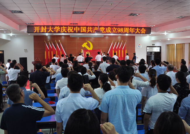 党委组织统战部部长赵海胜带领老党员重温入党誓词、新党员宣誓。继续教育学院院长、教工党支部书记葛华,材料与化学工程学院辅导员、学生党支部书记陈彦霏分别代表优秀党务工作者和优秀共产党员进行了发言,他们都表示要加强自身学习,不忘初心,牢记使命,立足本职工作,发挥先锋模范作用,凝心聚力,团结拼搏,做合格的人民教师,做优秀共产党员。
