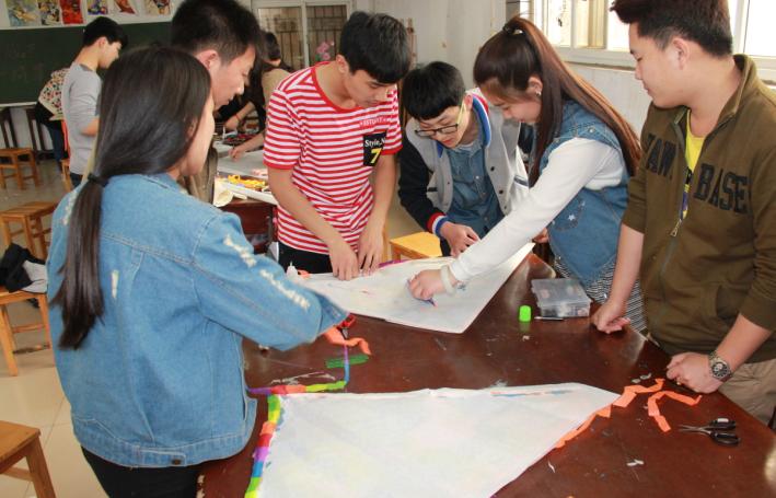为了培养学生的创新意识、动手能力和团结协作精神,2014年4月16日中午,在综合楼705教室,辅导员赵贝西带领2013级旅游工艺品设计与制作班全体同学举办了一次风筝创意大赛特色班级活动。