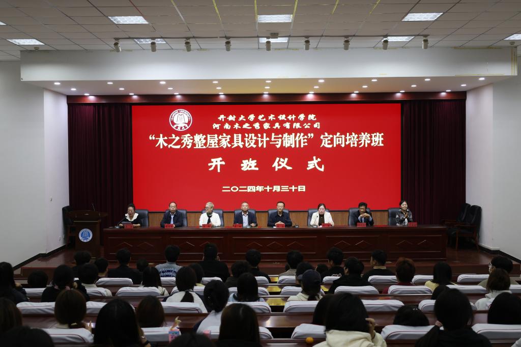 10月30日,bat365在线官方网站艺术设计学院与木之秀整屋家具设计与制作公司订单班开班仪式在行政楼第一会议厅举行。副校长李治、教务处处长王茜、产教融合服务中心主任师兆忠、河南木之秀家具有限公司董事长李鹏、总经理江霞、设计总监李萍、艺术设计学院党总支书记赵志成、院长张富云,环境艺术设计专业教师和全体环艺学生参加开班仪式,仪式由艺术设计学院副院长袁颖主持。