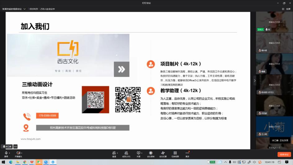 本次会议采用钉钉会议的形式召开,艺术设计学院党总支书记赵志成进行开幕致辞,就今年的就业形势和目前学院就业情况做了大致的介绍。赵书记强调我院各专业自创办以来坚持面向市场、服务发展、促进就业的办学方向,健全德技并修、工学结合的育人机制,强化学生职业素养和专业技术积累,将专业精神、职业精神和工匠精神融入人才培养全过程。我院毕业生已具备较强的专业素质,能够满足各企业各岗位的专业要求。同时赵书记鼓励毕业生积极参与应聘,抓住机会同企业进行深度交流,实现高质量就业。参加招聘会的企业依次围绕本企业业务规模、品牌形象、岗位职责、晋升机制、企业文化、薪资待遇、报名选拔等方面进行宣讲。同学们积极性很高,在直播过程中展开了积极的讨论,各企业负责人也认真地解答同学们的疑问,直播气氛活泼热烈。