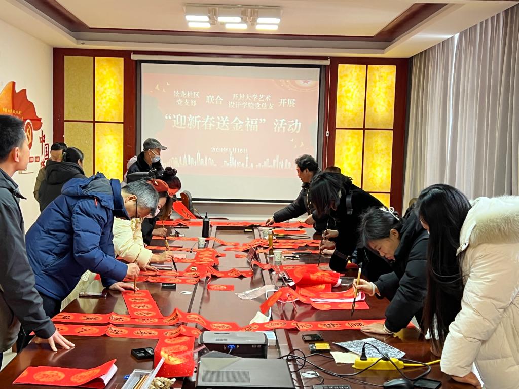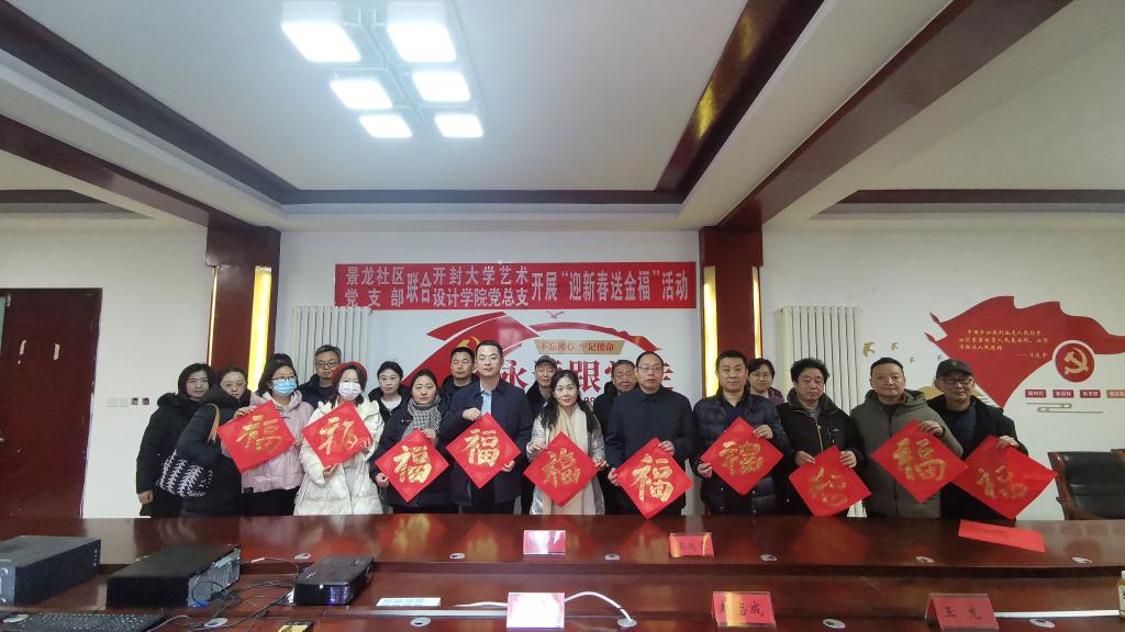 新春佳节将至,为传承中华年俗文化,营造喜庆祥和的节日氛围,丰富广大居民群众的精神文化生活,1月16日上午,在党总支书记赵志成、院长张富云的带领下,艺术设计学院10余名党员教师到景龙社区开展“迎新春 送金福”志愿服务活动,现场为群众写春联、送福字,用实际行动为社区居民送上“年味十足”的新春祝福。