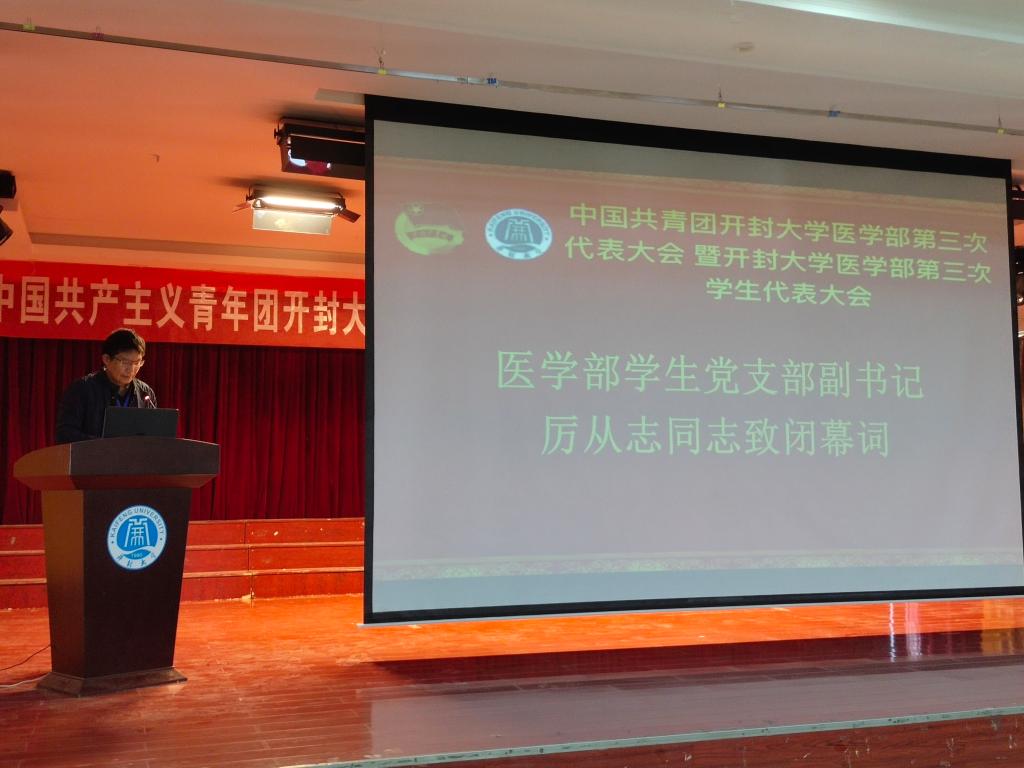 十一月十一日,大会如期而至,bat365在线官方网站党委委员、开封市卫生学校党委书记曾小平、bat365在线官方网站团委书记刘圣亚、bat365在线官方网站医学部党总支书记谢旭光、bat365在线官方网站医学部学生党支部副书记厉从志、bat365在线官方网站医学部团总支书记崔俊莉以及辅导员老师们莅临了本次大会。窗外冬日骄阳明烈,室内国歌、团歌庄严响起。医学部各代表着装整齐,手持国旗,伴随着歌曲,齐声高歌。