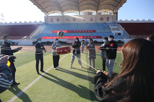 本站讯 11月10日下午,我校心理健康教育中心在体育场围绕“团队建设促交往,助我人生乐成长”主题开展了“2021级新生心理素质拓展训练”团建活动。校党委书记陈灿,校党委委员、工会主席成芳到场指导,活动由学生工作部副部长梁波主持。